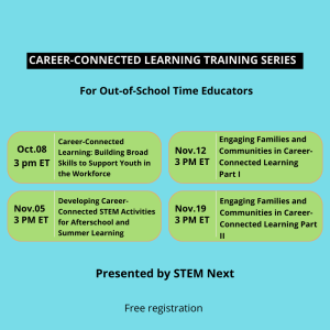 STEM Next is accelerating our efforts to advance career-connected learning in afterschool and summer learning programs with the introduction of our Career-Connected Learning Framework for Out-of-School Time Providers. This new tool is for out-of-school time providers and staff who want to design and implement career-connected STEM learning experiences in afterschool and summer programs. Throughout the series, program providers will learn about the four foundational strategies of career-connected STEM in OST and how to implement simple tactics and strategies to make your activities more aligned with careers. REGISTER FOR ALL TRAININGS HERE