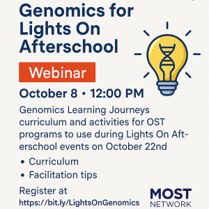 Getting ready for Lights On Afterschool on Oct 22? Join MOST on Oct 8 @ 12 PM ET for Genomics Learning Journeys—plug-and-play DNA/genomics activities, materials lists, and facilitation tips you can use right away. Free + practical.